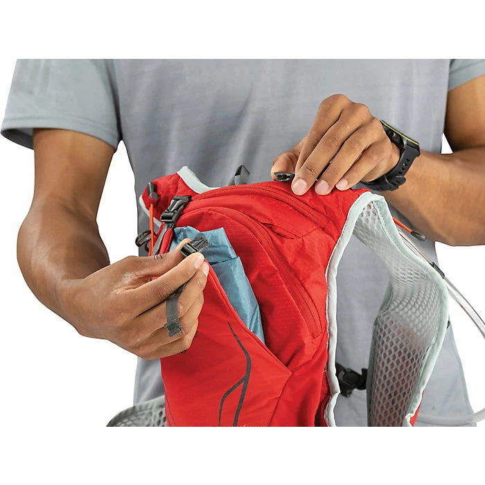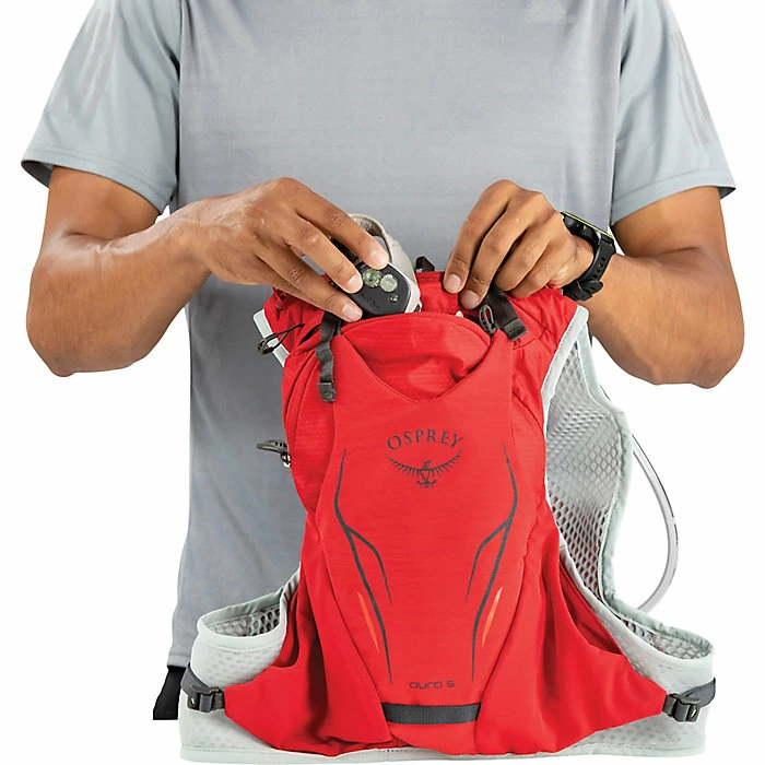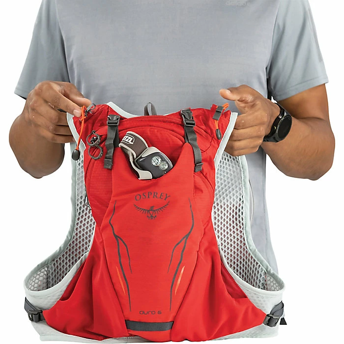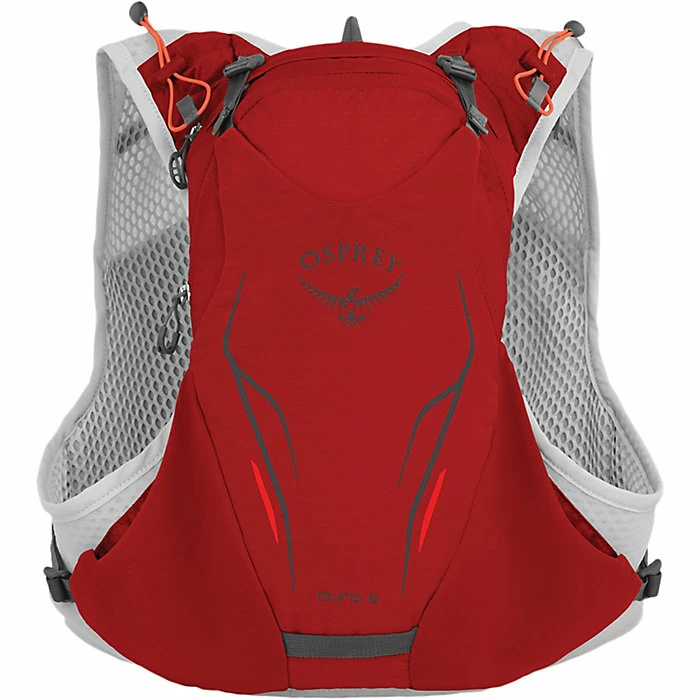 The Osprey Duro 6 Hydration Pack is a running vest with 1.5L reservoir included. The mesh backpanel and shoulder straps are comfortable and help cool while the dual sternum straps offer security. The close-fit stays put and prevents bounce while you run. Grab a drink from the hose when you need it, otherwise the magnetic QuickConnect keeps it close by.
