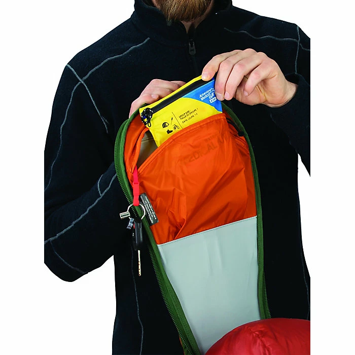 - Large front panel J-zip access to avalanche safety kit pocket with shovel handle and probe sleeves